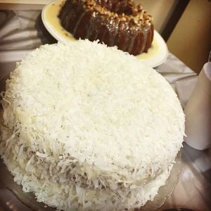 Double layered cake with smooth coconut frosting and covered in delicious coconut flakes.